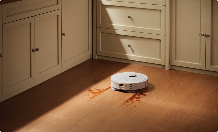 Echipat cu două mopuri rotative care pot fi ridicate, robotul curăță cu ușurință petele dificile de pe suprafețele dure. Când detectează covoare, ridică mopurile automat pentru a le menține uscate, asigurând curățarea eficientă.