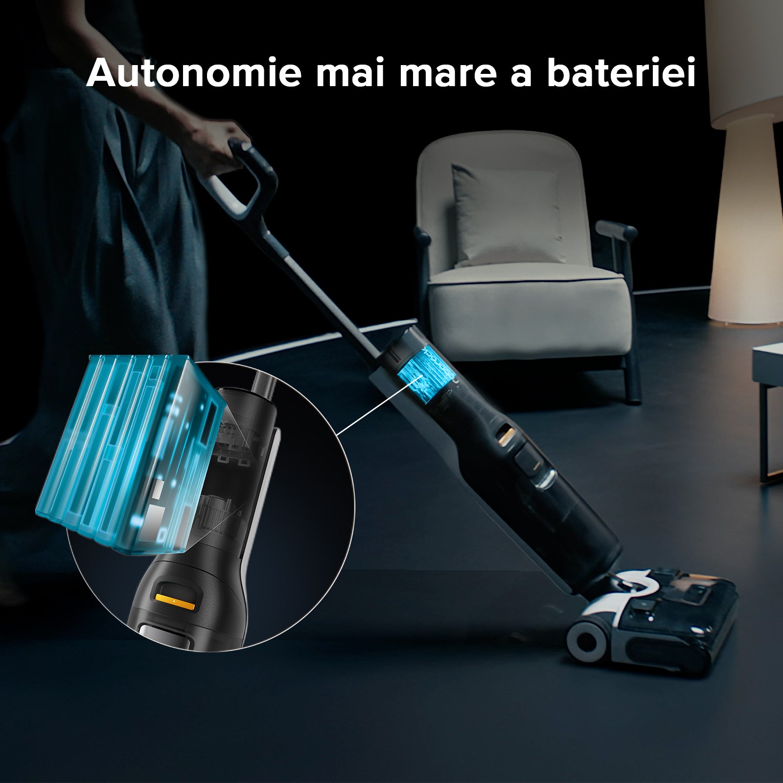 Cu o autonomie a bateriei de 60 de minute în modul Eco, acesta oferă sesiuni de curățare neîntrerupte, acoperind până la 410 mp (4.413sqft), înainte de a necesita reîncărcare.