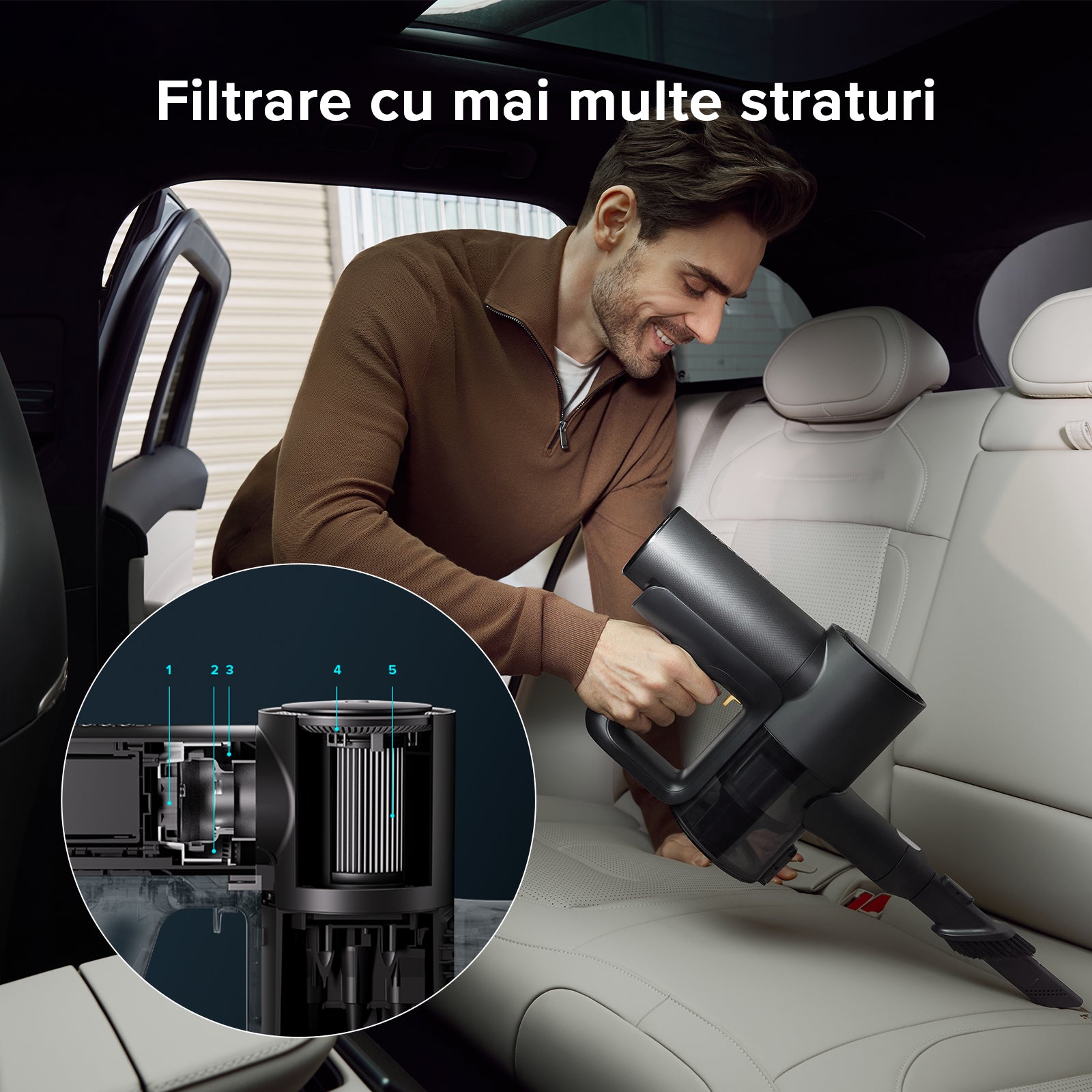 Forțe ciclonice puternice combinate cu un sistem de filtrare cu cinci straturi de nivelul micronilor separă particule de praf de 8 ori mai mici decât PM 2,5, împiedicând înfundarea filtrului și poluarea cu praf.