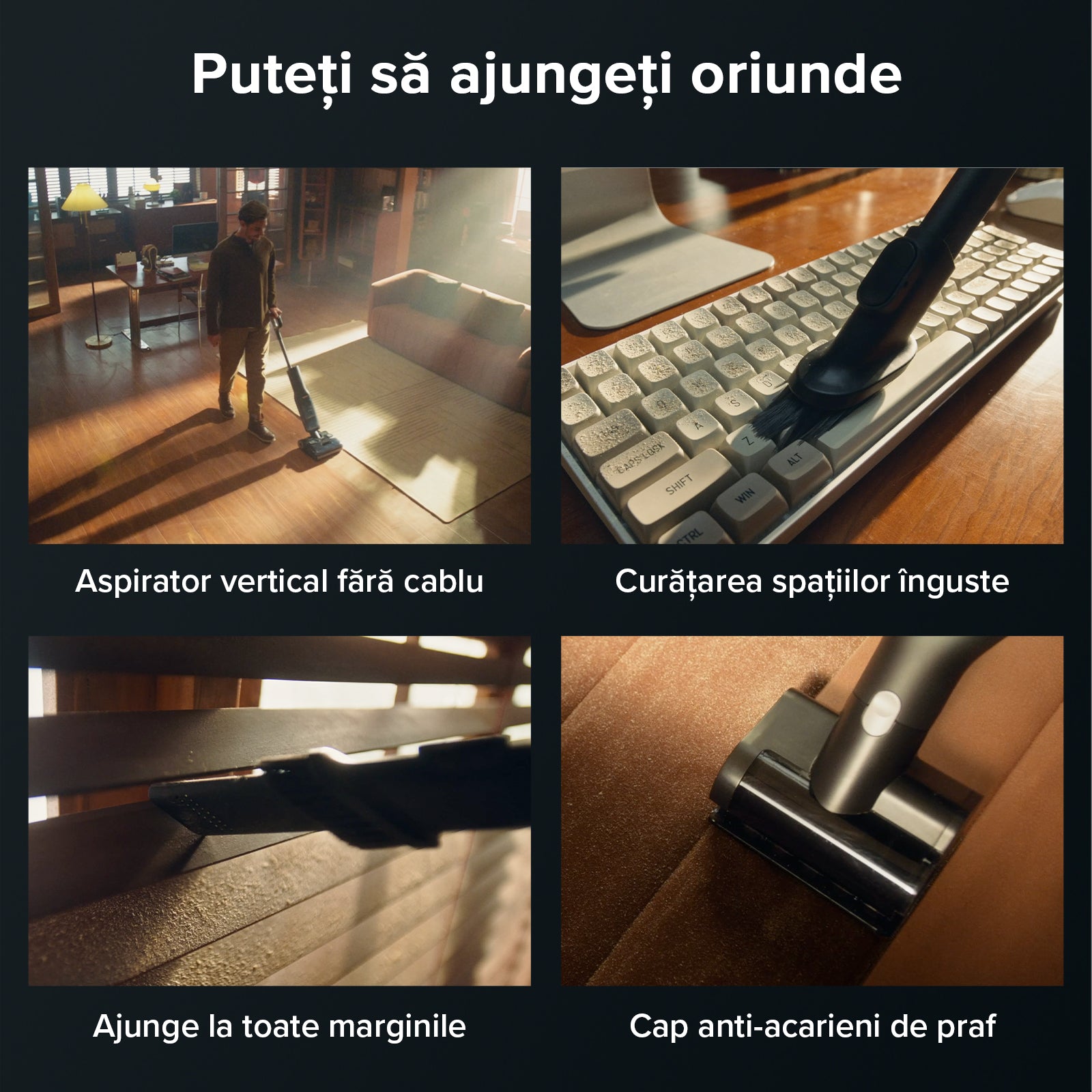 Aspirator cu curățare umedă și uscată: Curățați atât reziduurile umede, cât și pe cele uscateAspirator vertical fără cablu: Eliminați praful grație puterii de aspirare sporite și fără pierderi1]Cap anti-acarieni de praf: Îngrijire meticuloasă pentru persoanele afectate acarienii de praf 2Curățarea spațiilor înguste: Peria pentru curățarea spațiilor înguste este concepută pentru spațiile dintre piesele de mobilier și marginile ferestrelor