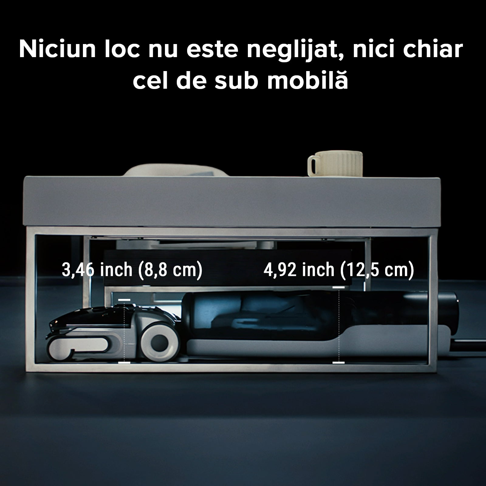 Putere în spații înguste cu un design plat de 12,5 cm 5 care menține aspirarea completă la 0°. Profilul său foarte jos ajunge în fiecare colț, fără să lase praf în urmă.