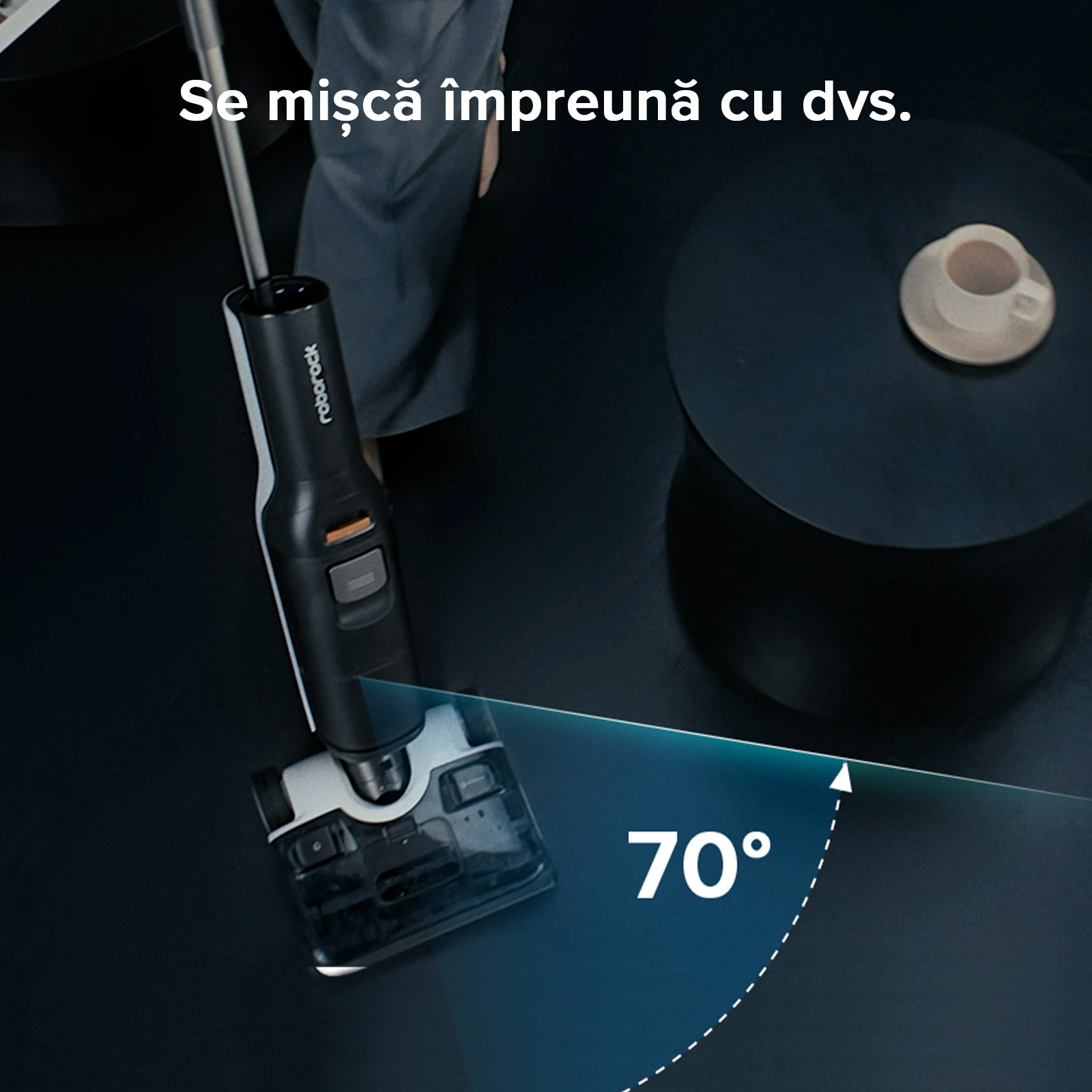 Îmbunătățit cu un rezervor de apă poziționat mai jos și un design pivotant la 70°, vă permite să glisați fără efort pe lângă mobilier și obstacole, oferind o curățare mai lină și mai eficientă.