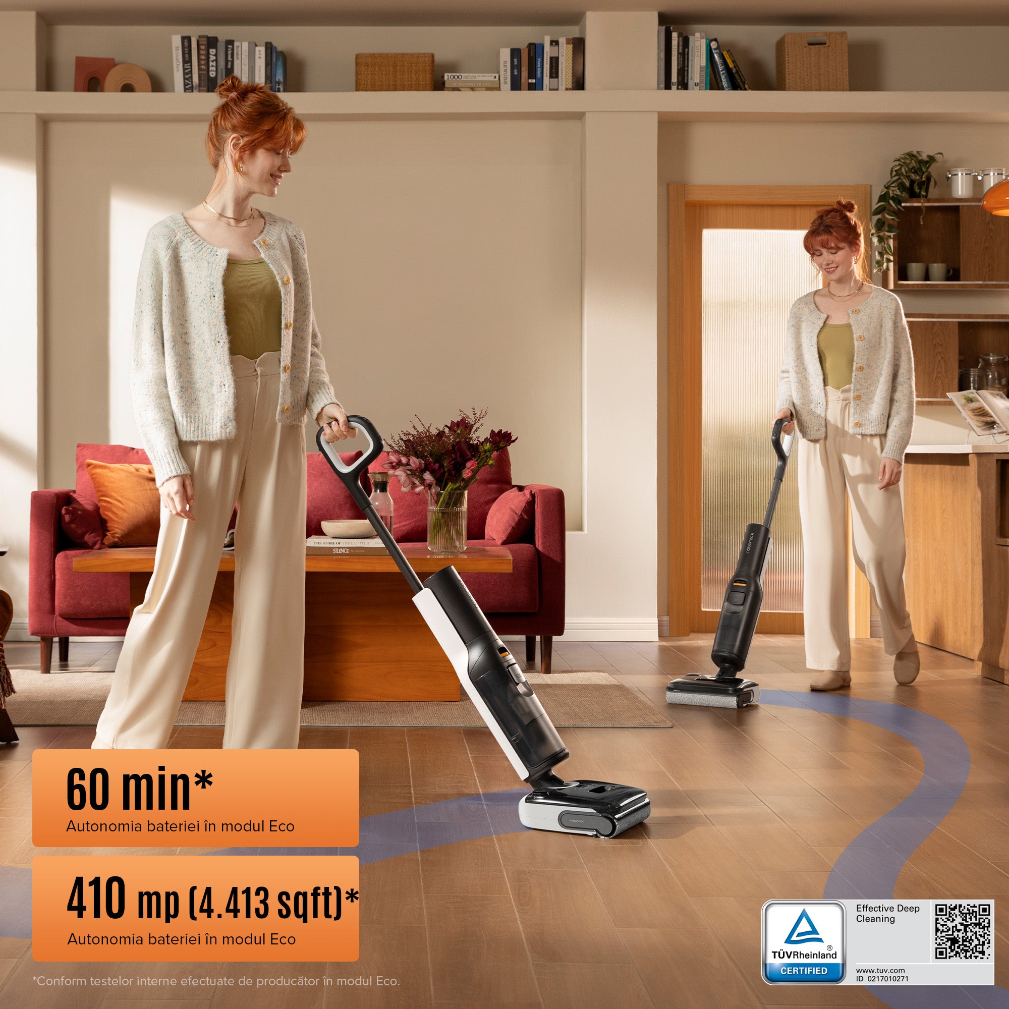 Cu o autonomie a bateriei de 60 de minute în modul Eco, acesta asigură sesiuni de curățareneîntrerupte, acoperind până la 410 mp (4.413 sqft) înainte de a necesitareîncărcare.3