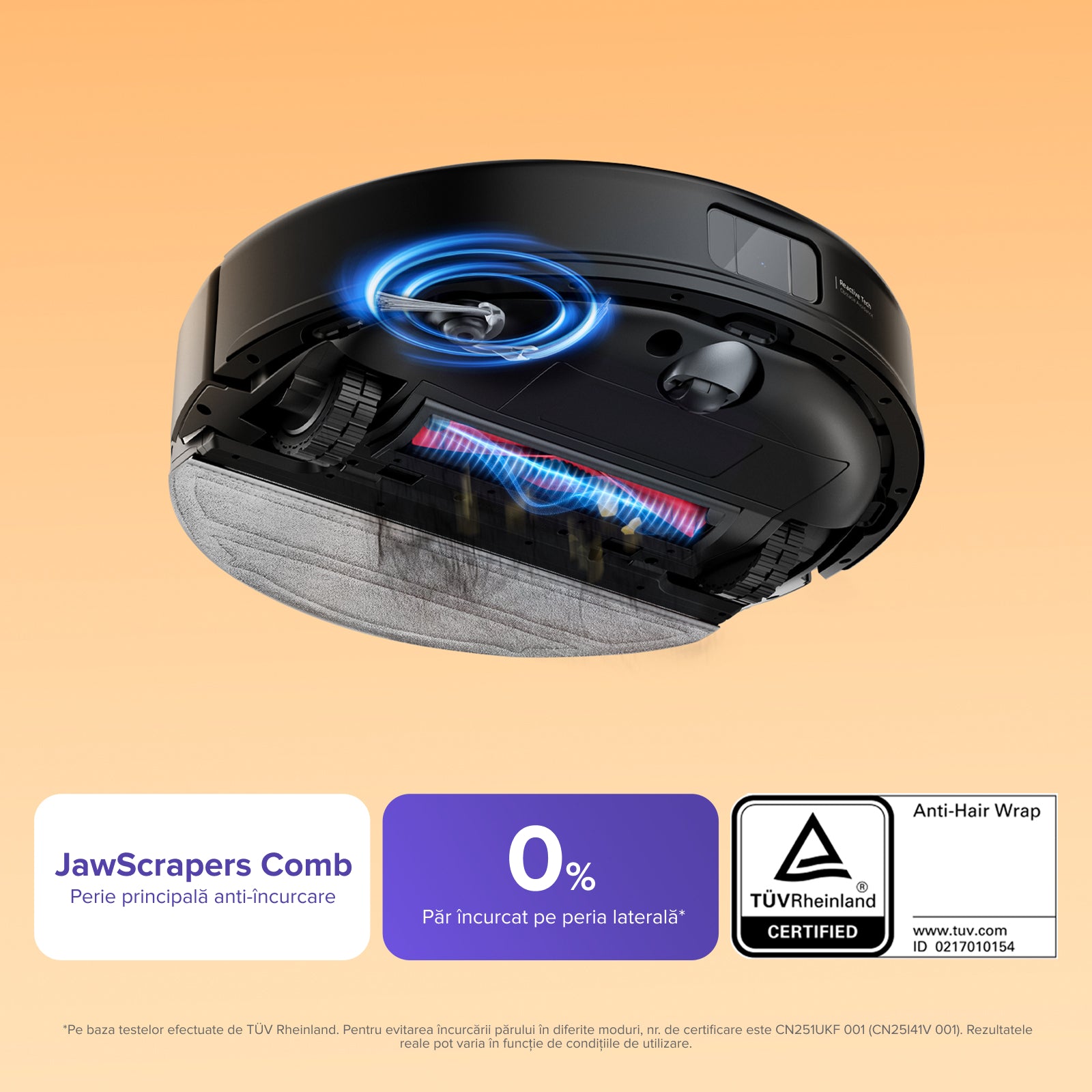 Dotat cu peria principală anti-încurcare Pieptenele JawScrapers și cu perie laterală anti-încurcare, acest sistem avansat asigură funcționarea mai lină și întreținere redusă.