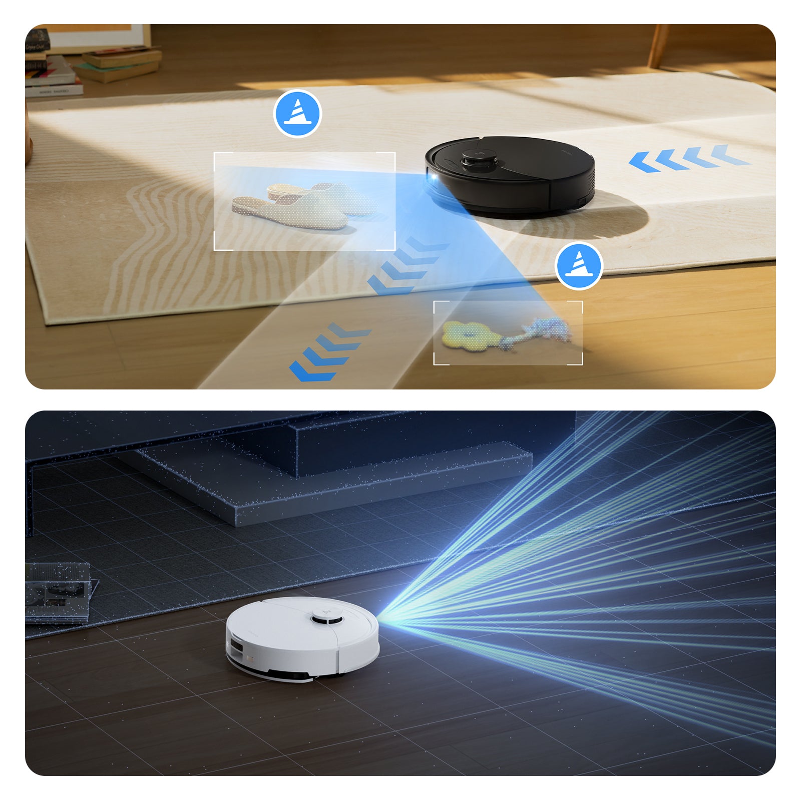 Detectează sau setează automat zonele de covor, crescând puterea de aspirare pentru o curățare mai profundă și îndepărtarea mai eficientă a murdăriei, asigurând o locuință mai proaspătă și mai curată.