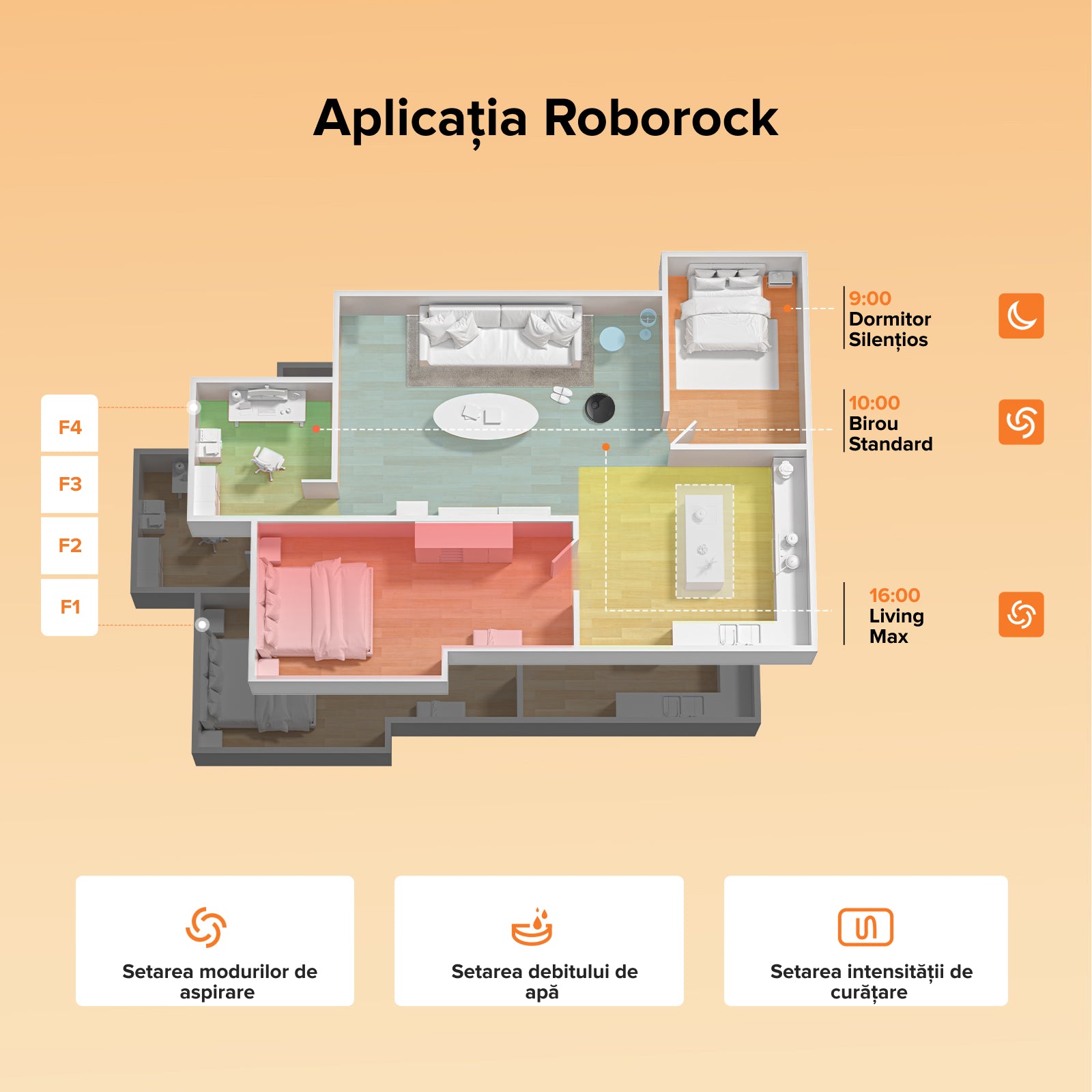 Setați o oră, modul de curățare și camerele ce trebuie curățate, iar procesul va începe automat.