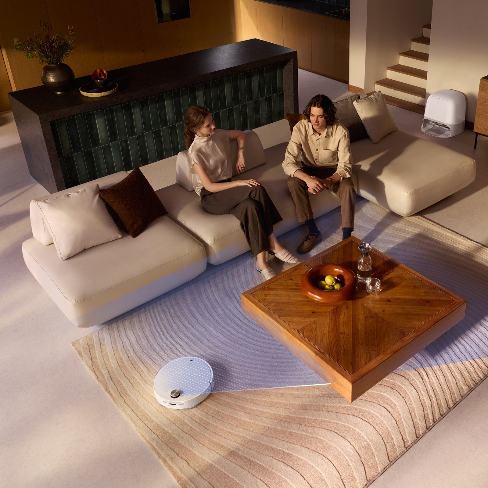 Stația de andocare subțire și rotundă a robotului Roborock Qrevo CurvX contribuie la eleganța locuinței dumneavoastră, încadrându-se perfect în spațiul de locuit și jucând în același timp rolul unui aparat de curățat extrem de funcțional.