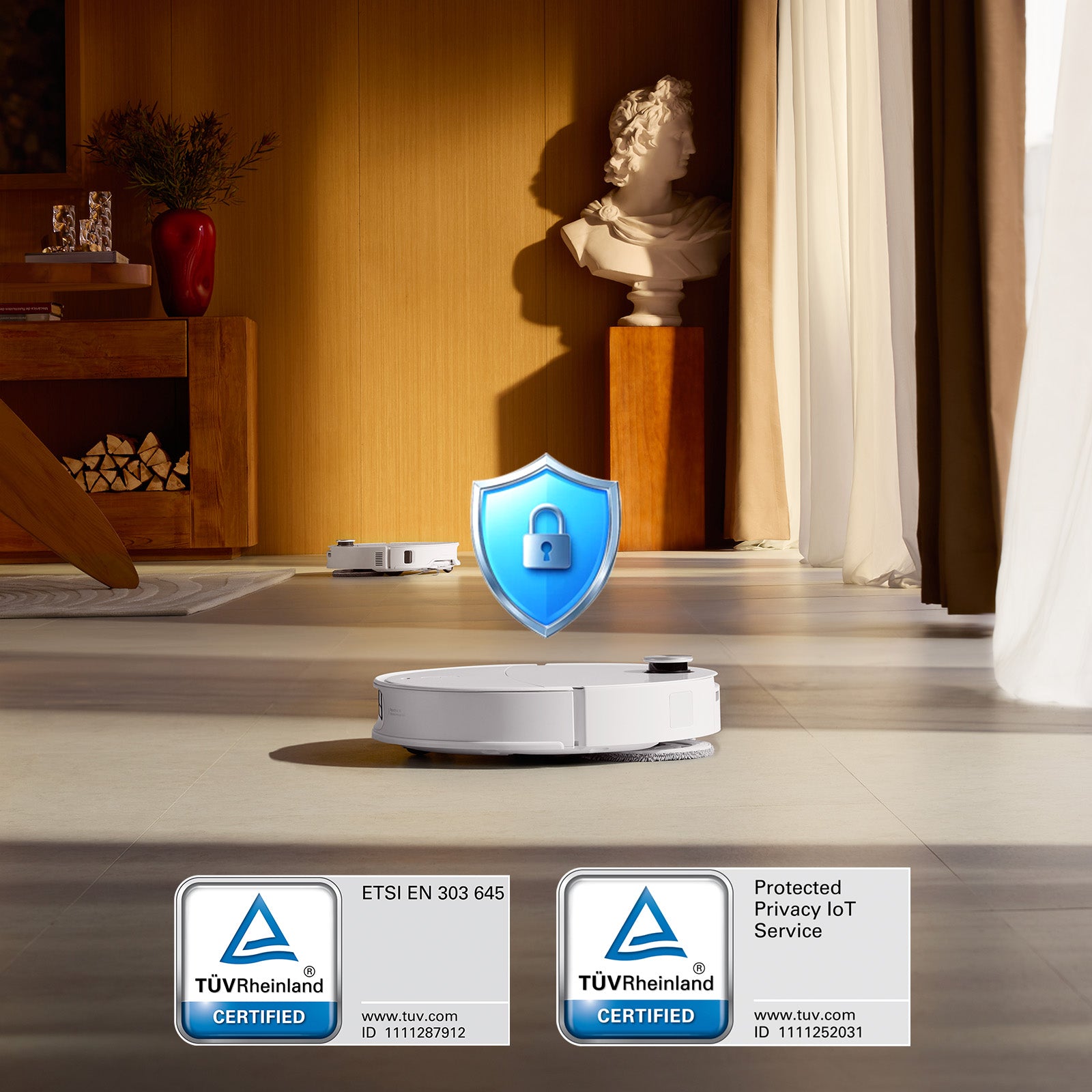 Concentrându-se pe confidențialitate și securitate, Qrevo CurvX asigură că nu sunt stocate imagini. Robotul este certificat de TÜV Rheinland ca produs pentru locuința inteligentă securizat. În plus, respectăm standardele de securitate cibernetică ETSI EN 303 645.