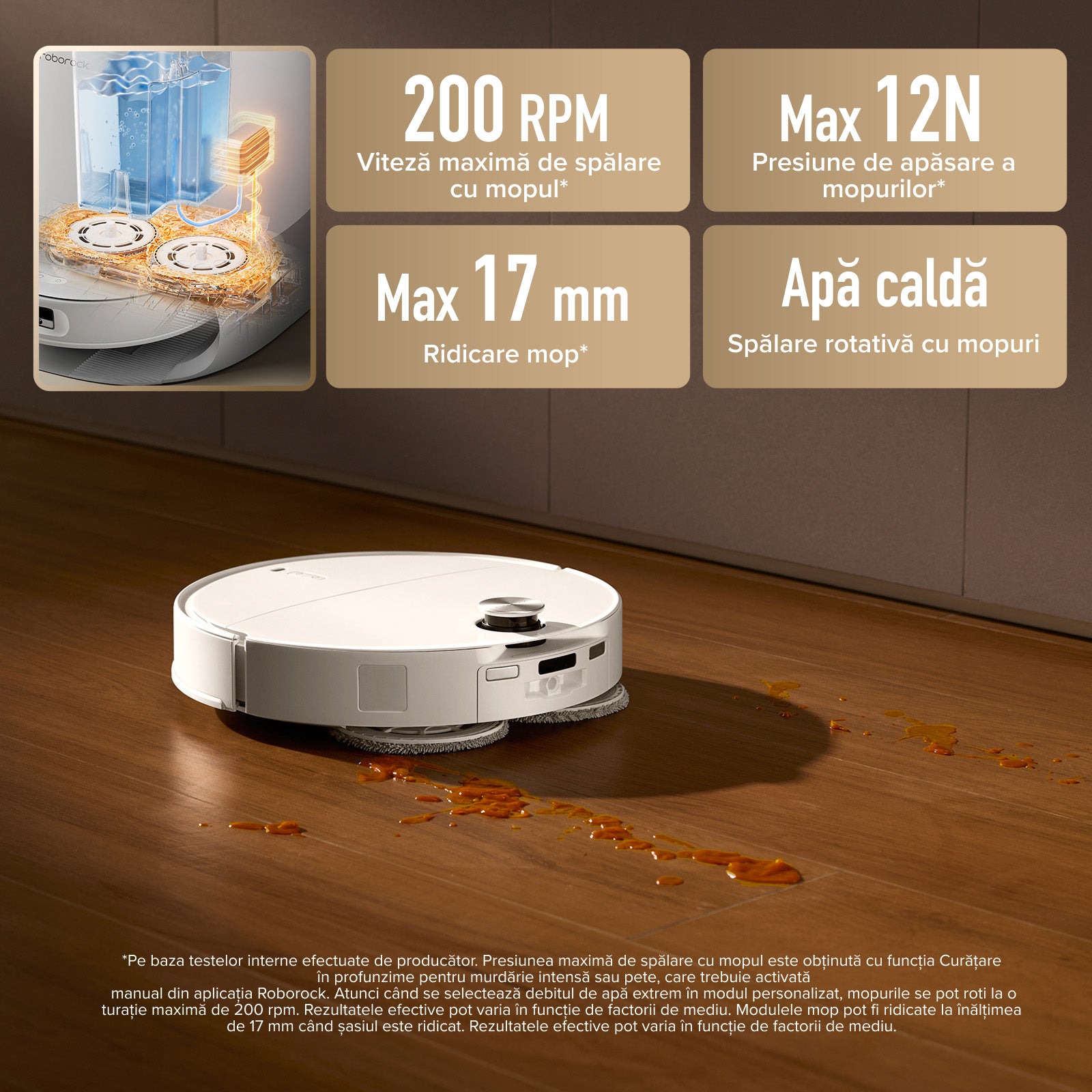 5. Pe baza testelor interne realizate de producător, presiunea maximă de spălare cu mopul este obținută cu funcția Curățare în profunzime pentru murdărie intensă sau pete, care trebuie activată manual din aplicația Roborock. Rezultatele efective pot varia în funcție de factorii de mediu.