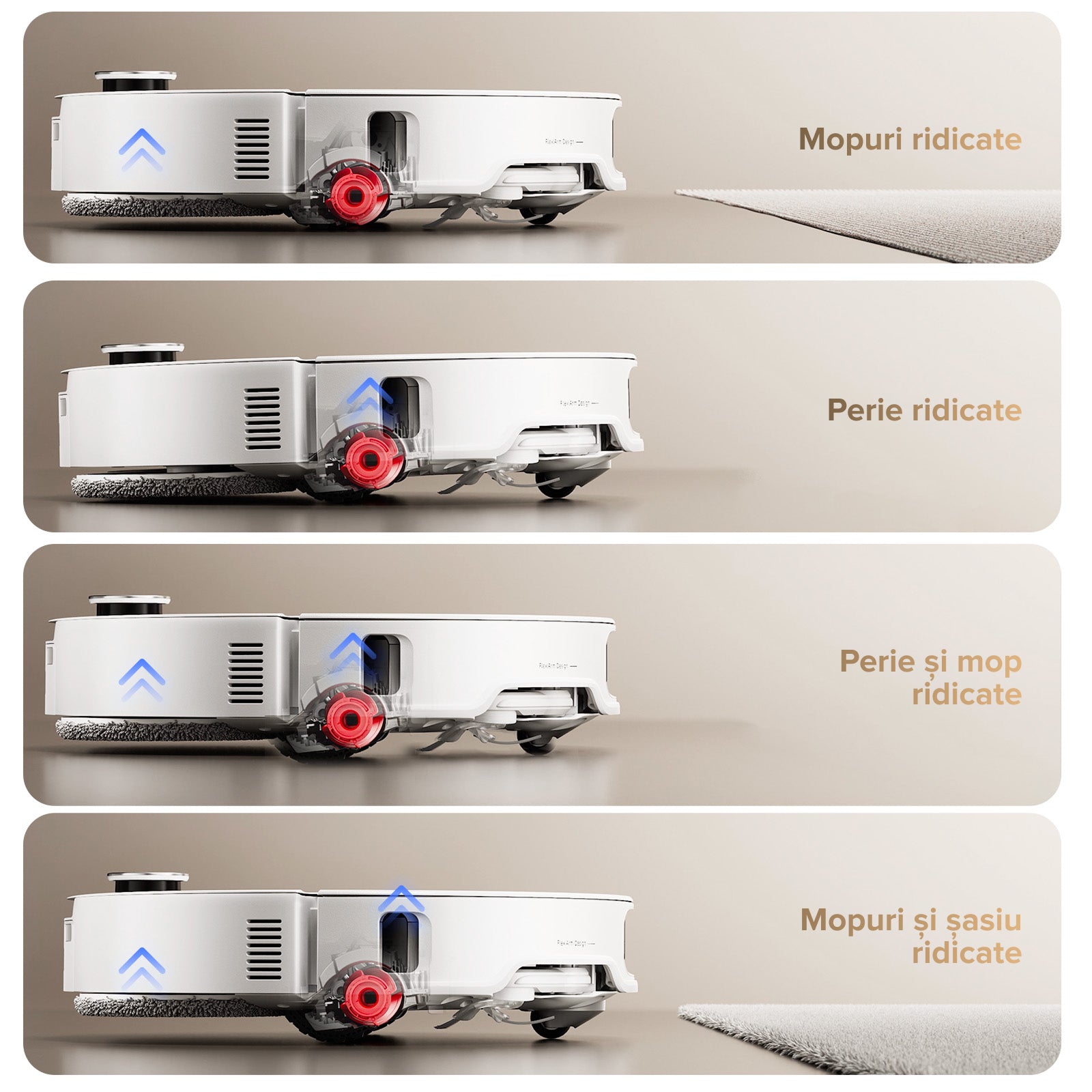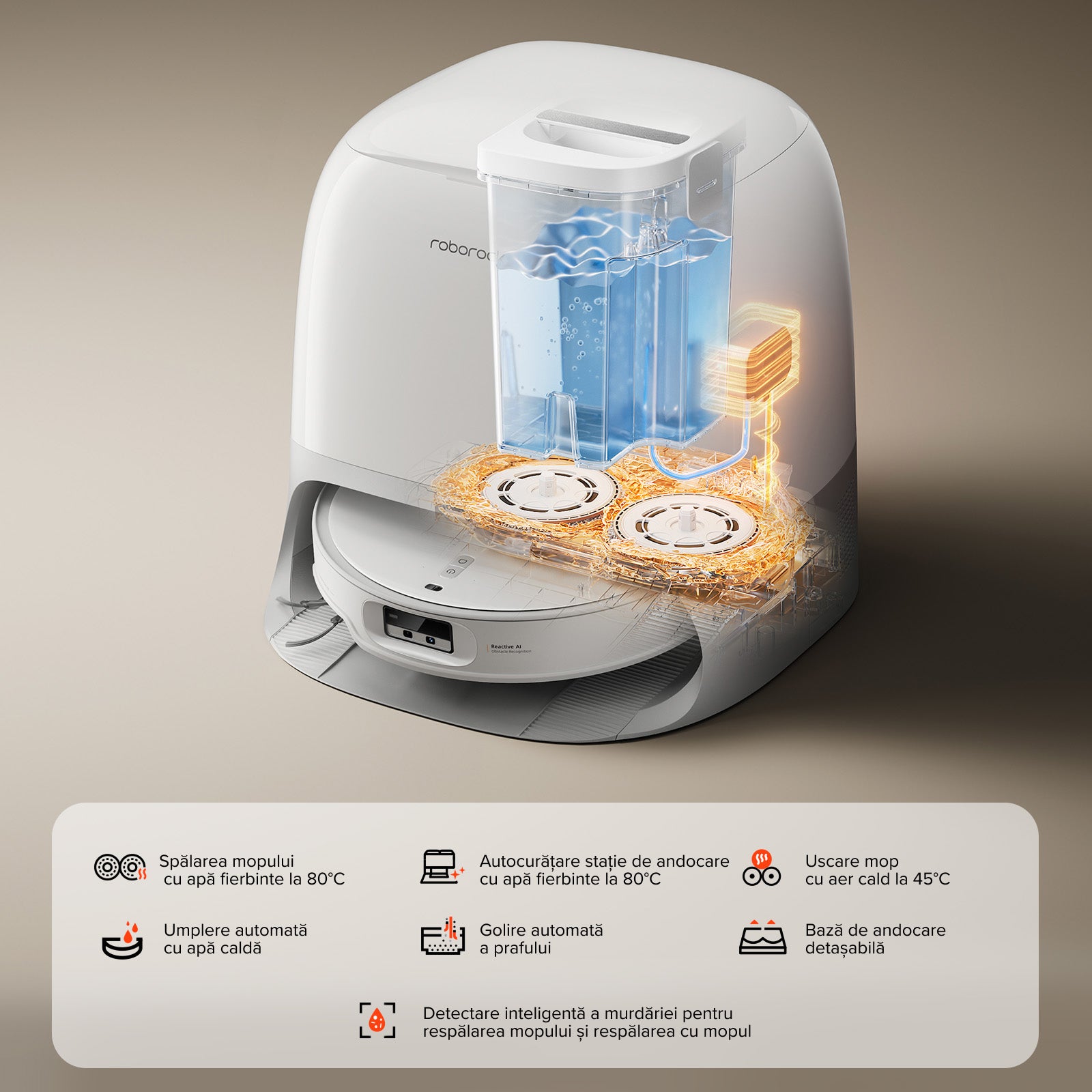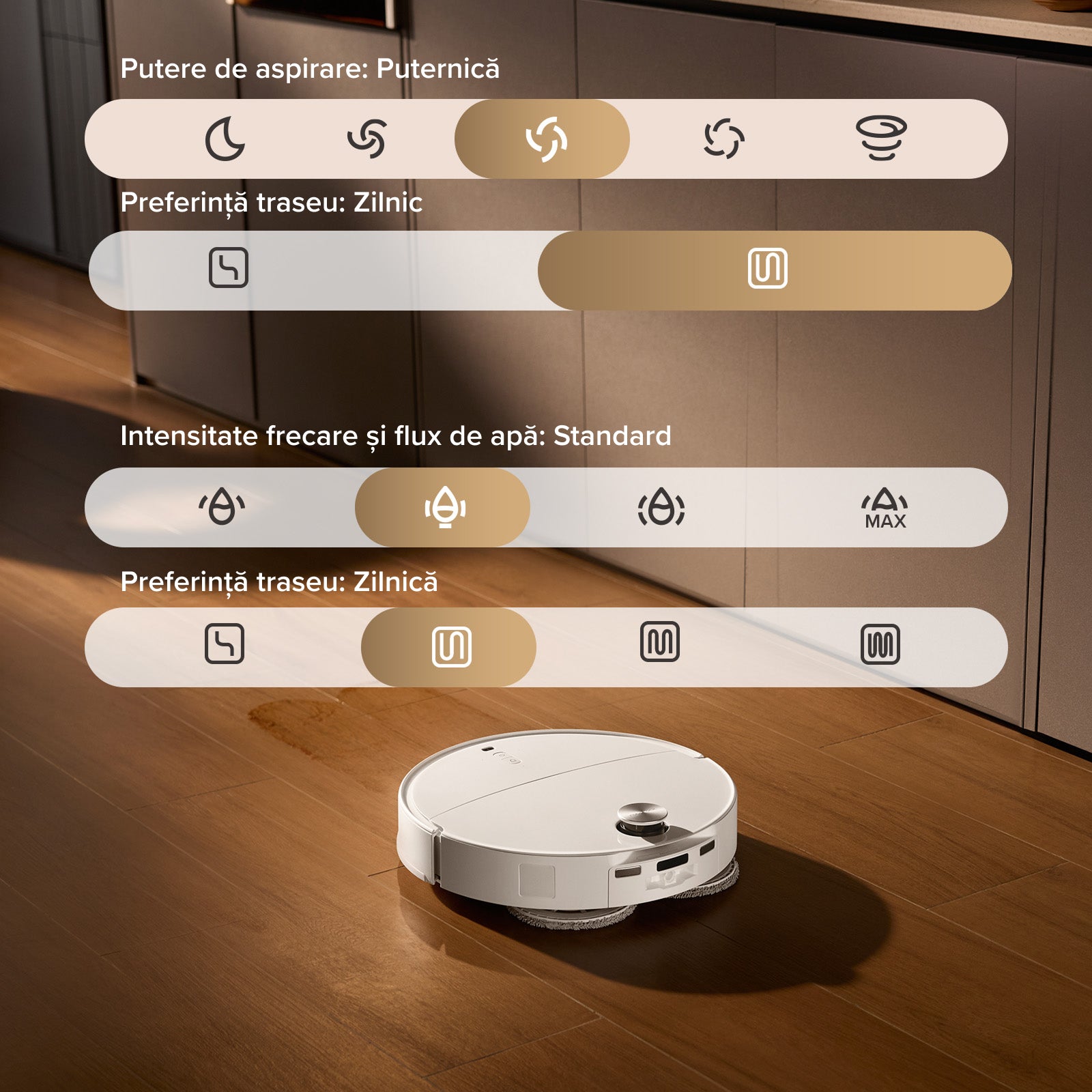 În timpul spălării mopului, funcția de detectare verifică starea de curățenie a mopurilor, asigurându-se că acestea sunt respălate după necesitate pentru rezultate impecabile.