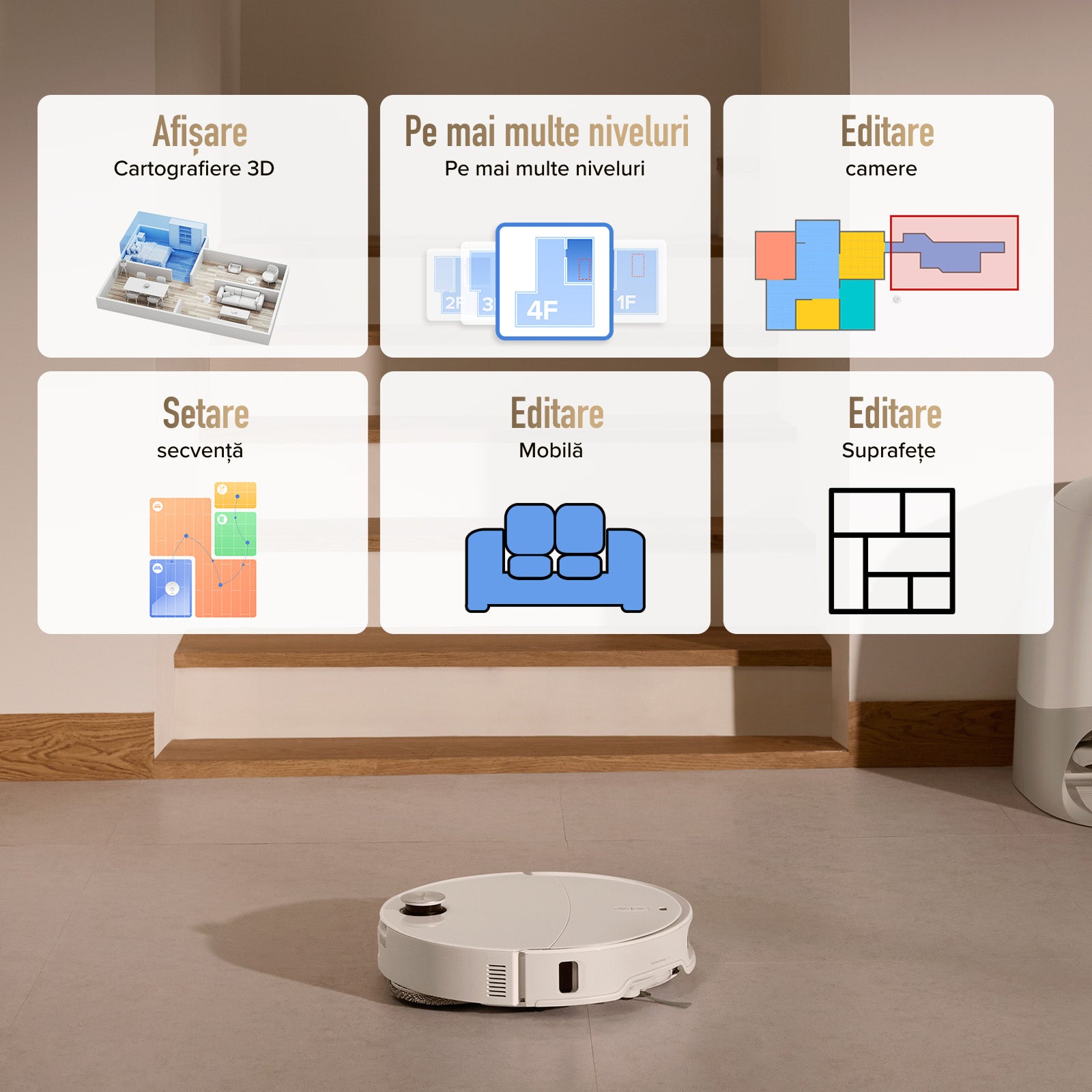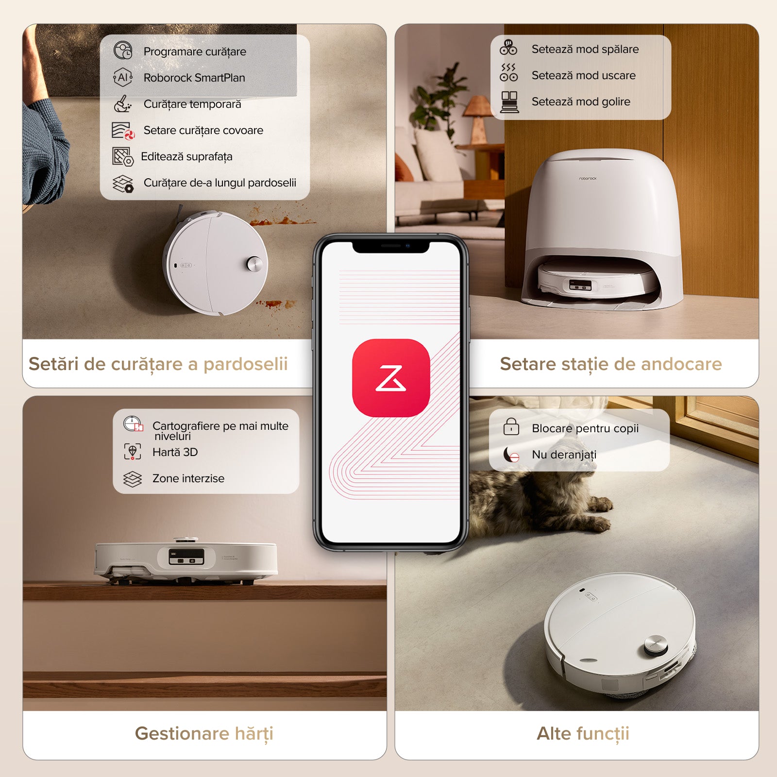 Programați curățenia, gestionați hărțile, ajustați setările stației de andocare și accesați funcții inteligente — toate din aplicația Roborock.