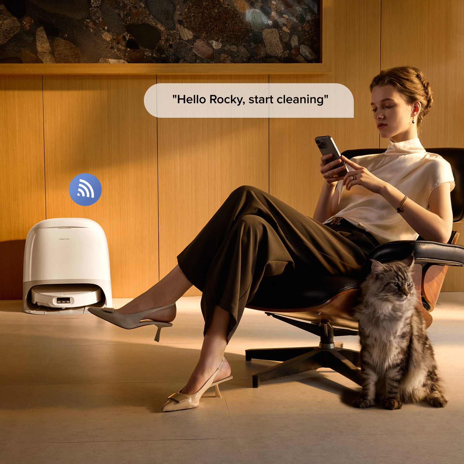 Spuneți doar „Hello Rocky” (Bună Rocky) pentru a iniția curățarea sau a ajusta setările—nu trebuie să ridicați niciun deget. Asistentul vocal inteligent este întotdeauna gata să ajute, chiar fără conexiune la internet. „Clean here" „Clean the kitchen" „Just vacuum"