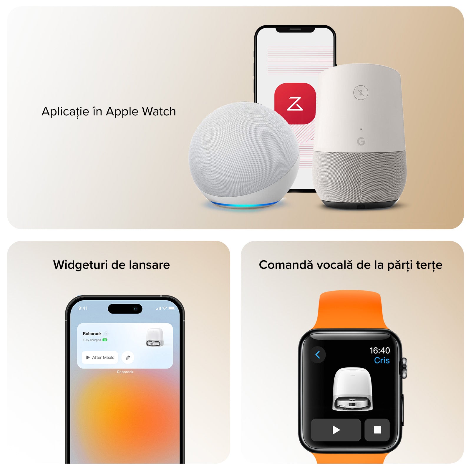 Control vocal de la terți Comenzi vocale prin Amazon Alexa, Apple Siri Shortcuts sau Google Home. Widgeturi de lansare Acces cu un singur click la rutine de curățare personalizate. Apple Watch App Începeți rapid curățenia sau faceți o verificare de stare.