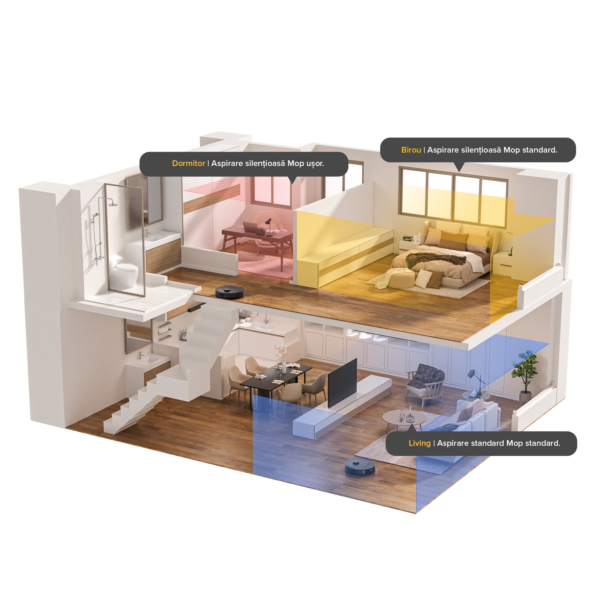 Sistemul de cartografiere pe mai multe niveluri recunoaște și creează automat hărți cu până la 4 niveluri. Tot ce trebuie să faceți este să lăsați robotul jos.