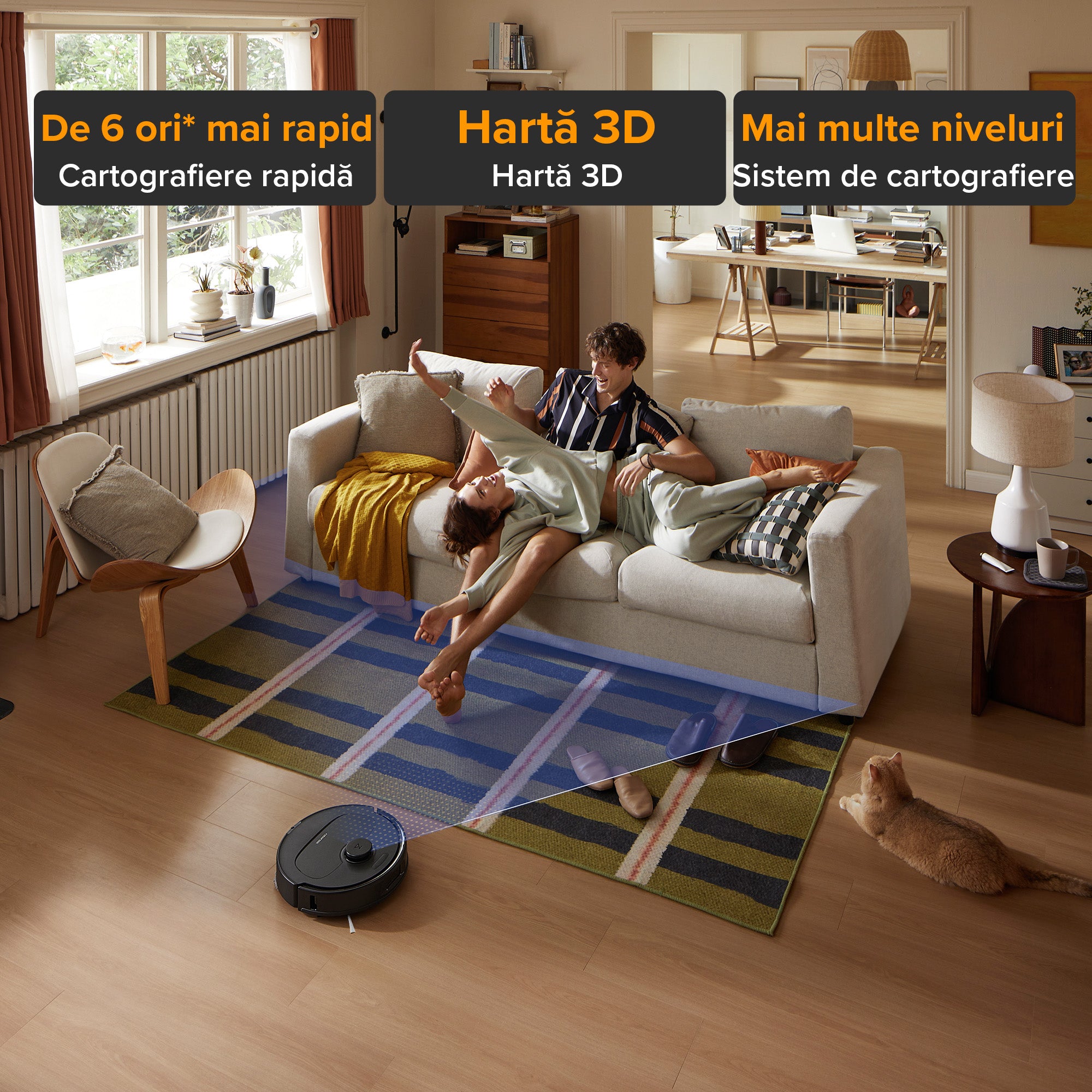 Bazat pe lumină structurată, robotul este pregătit să detecteze și să navigheze cu ușurință în jurul obstacolelor, chiar și în camere aglomerate cu obiecte împrăștiate pe pardoseală.