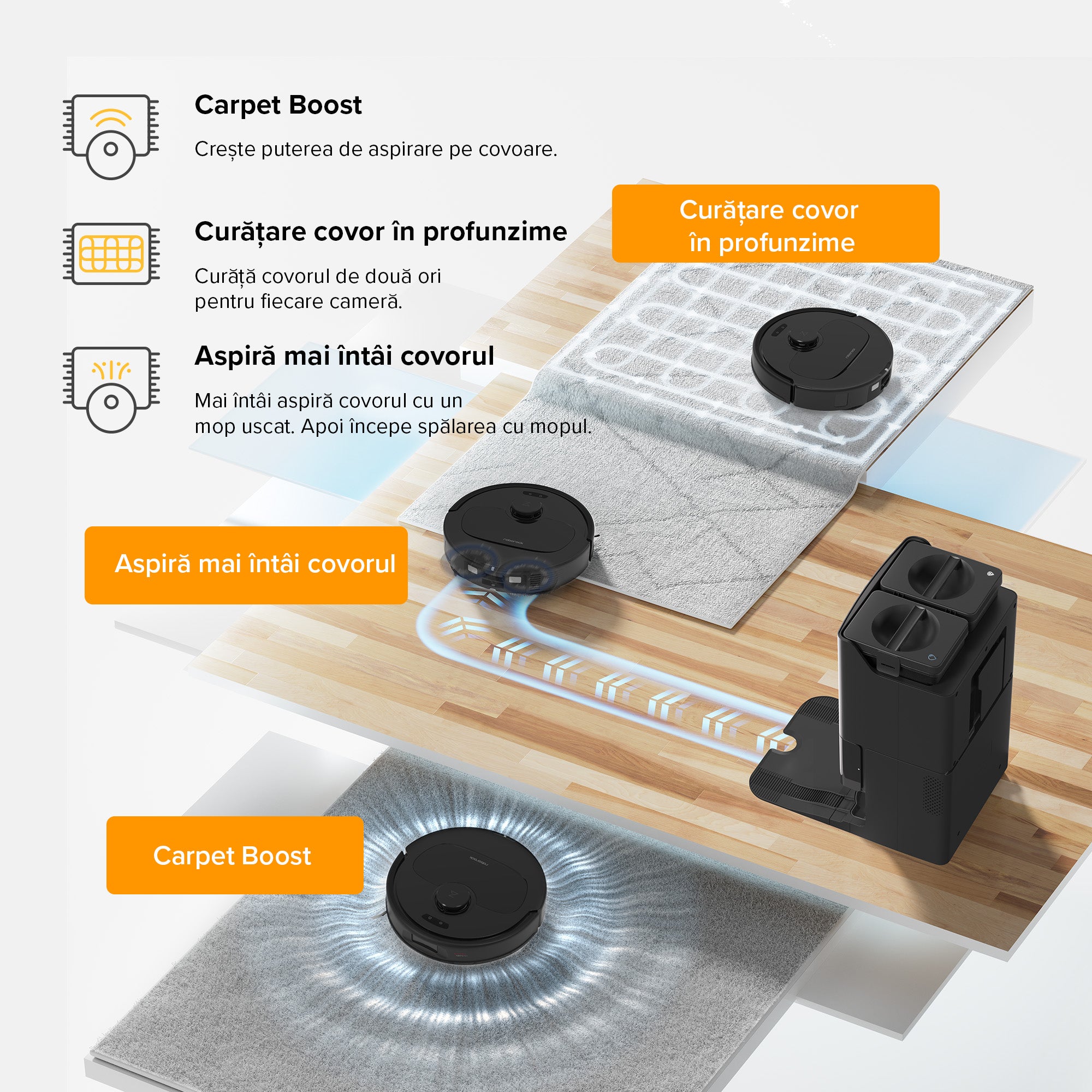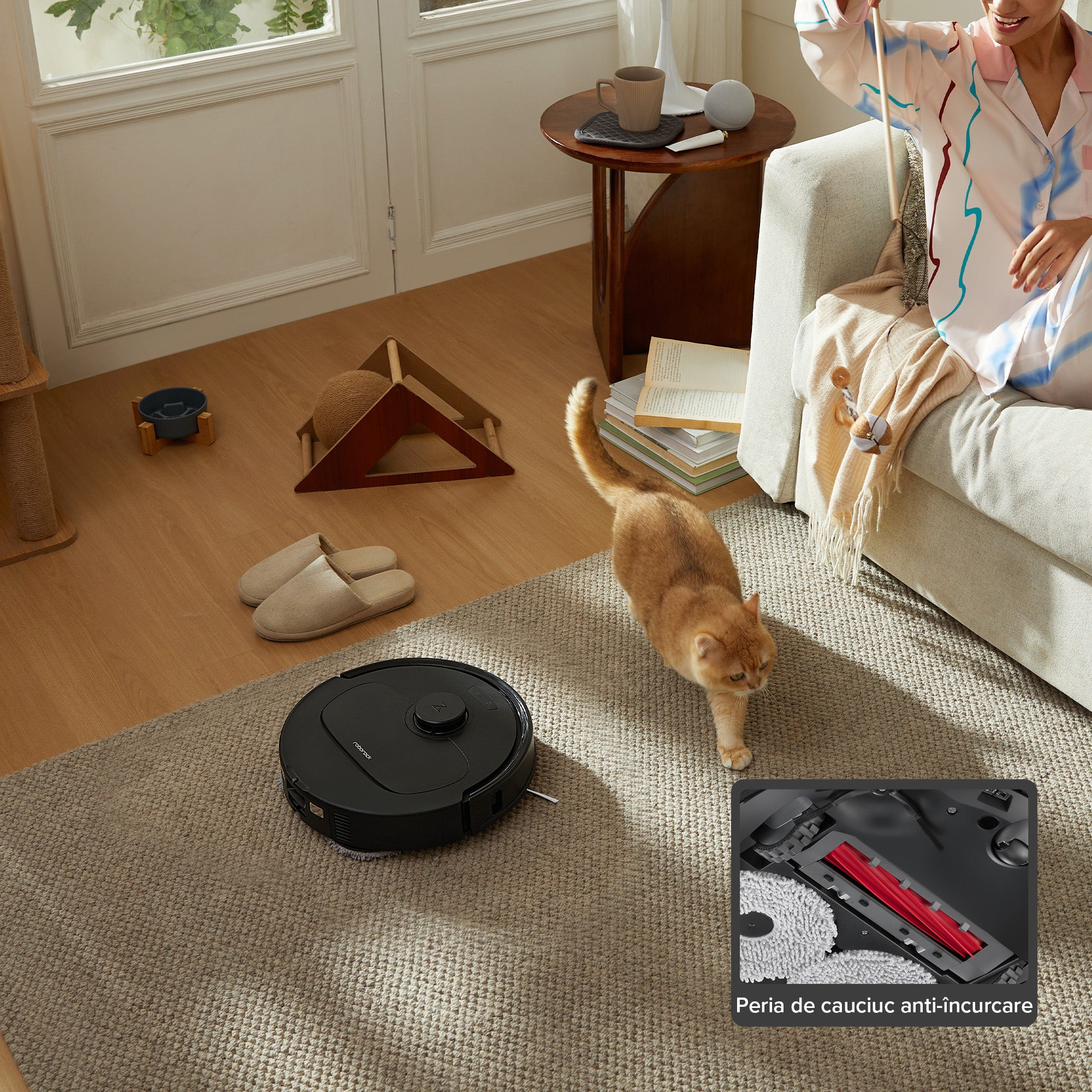 La detectarea unei cantități mari de păr, robotul își va crește frecvența de golire automată pentru a evita umplerea rezervorului de praf la revenirea la stația de încărcare.*
