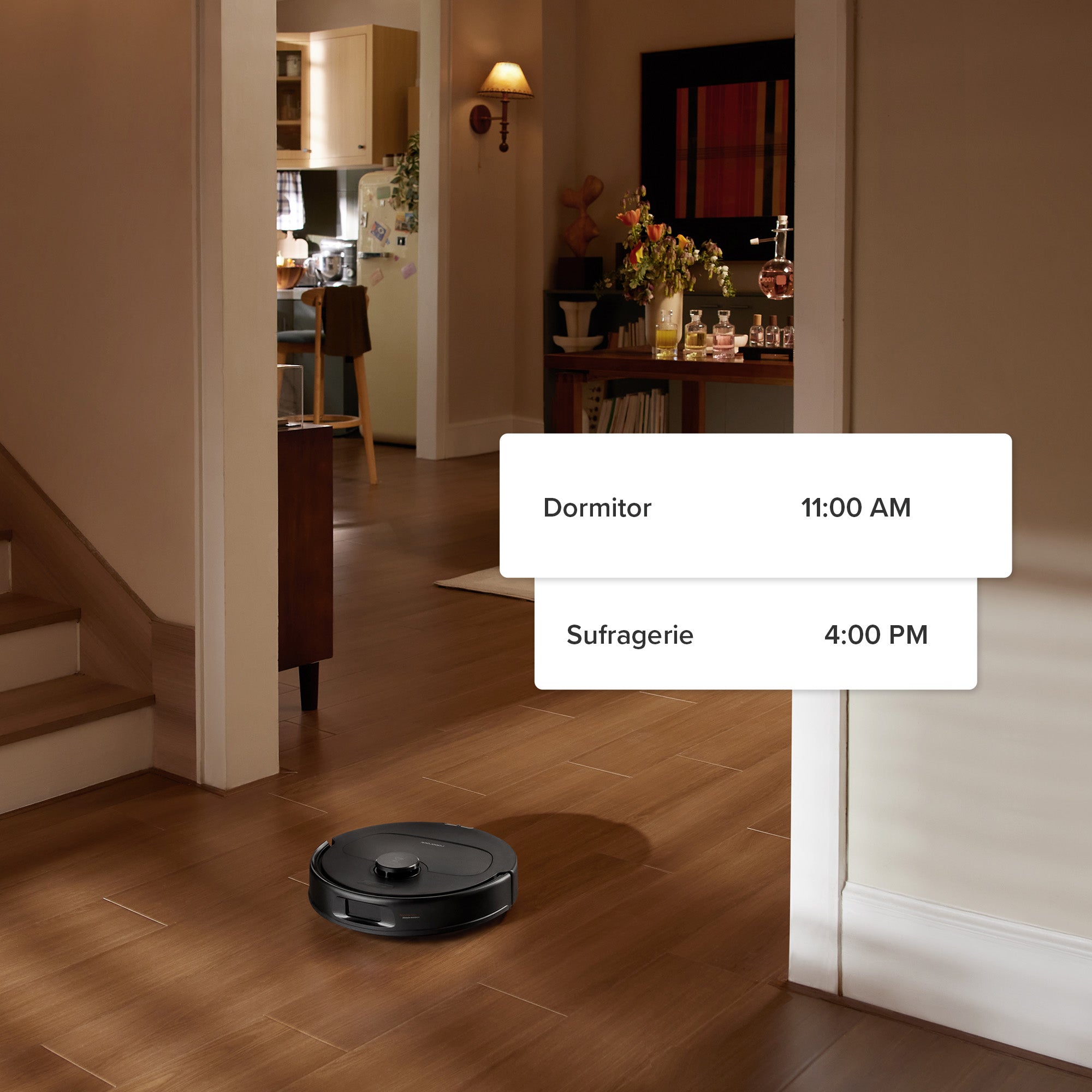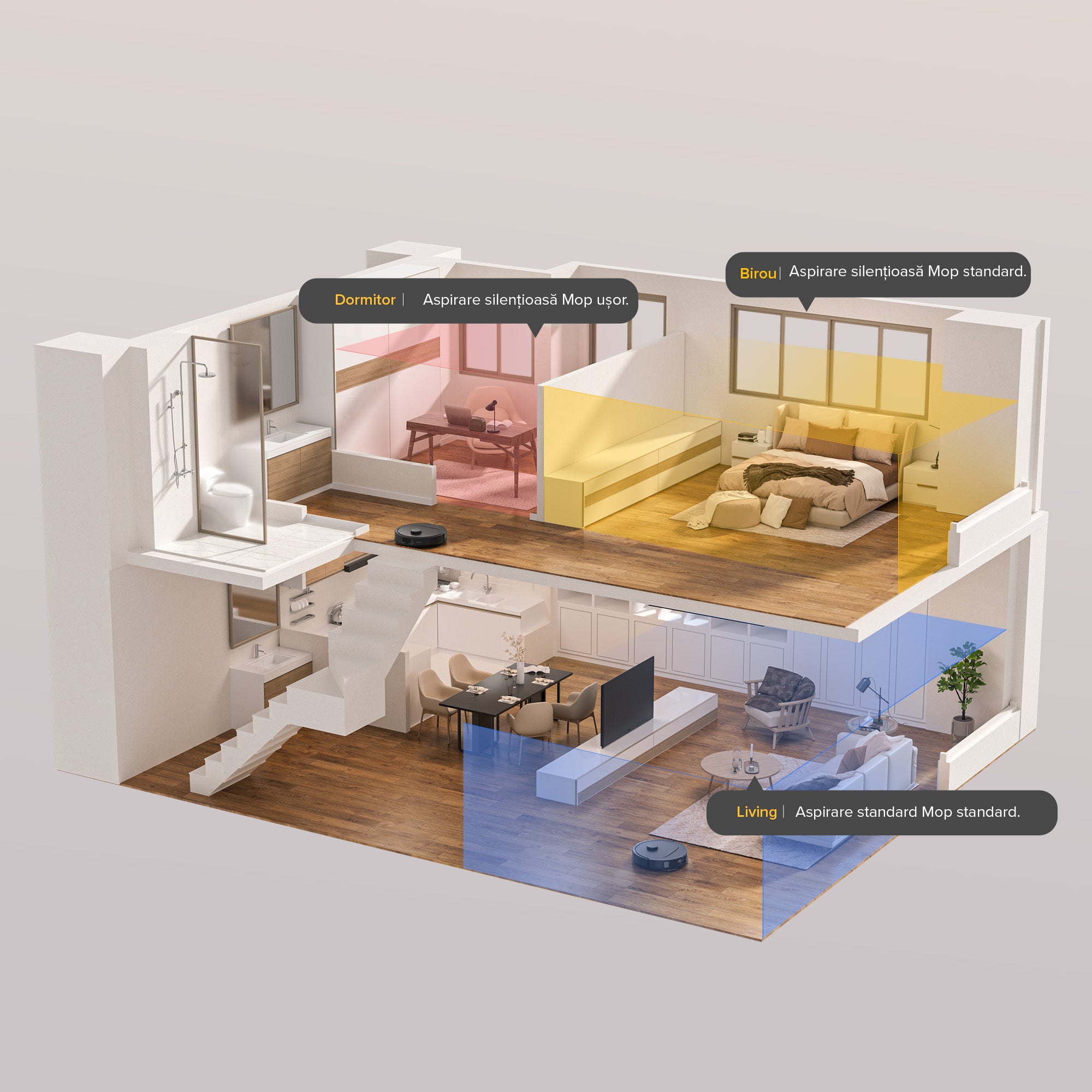 Prin setarea tipului de cameră și de pardoseală în aplicația Roborock, aspiratorul robot va fi personalizat pentru nevoile locuinței dvs. cu diferite debite de apă și niveluri de putere de aspirare pentru o curățare perfectă.