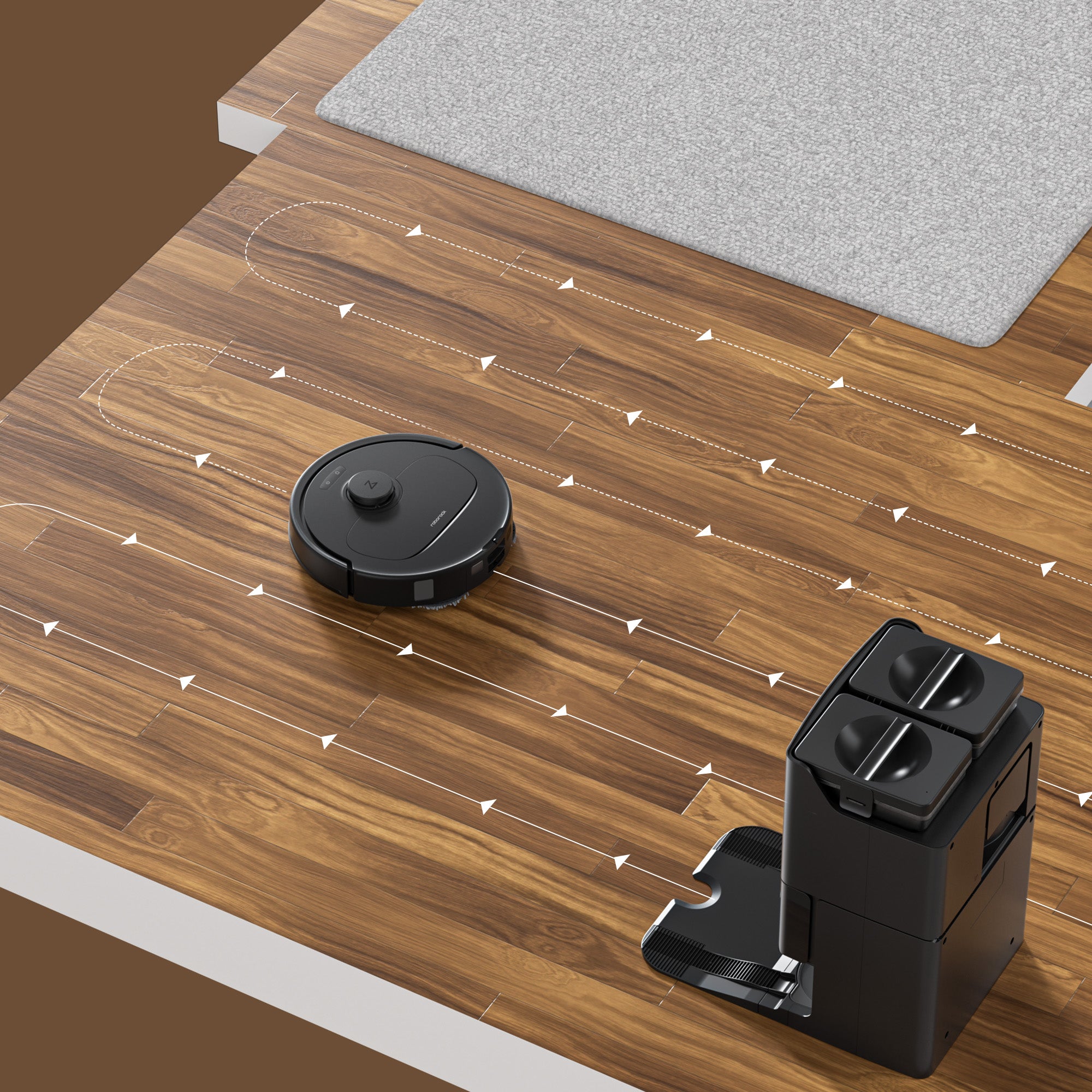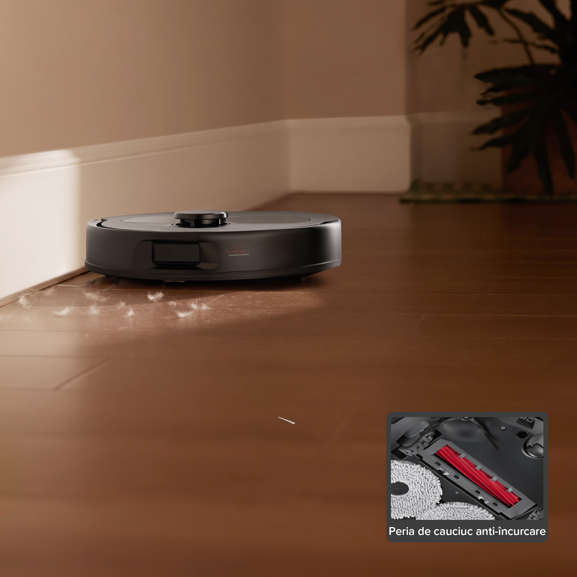 Robotul curăță de-a lungul direcției plăcilor prestabilite pentru a îndepărta mai bine părul și praful din crăpături, reducând în același timp zgomotul produs de peria principală care se freacă de crăpăturile pardoselii.