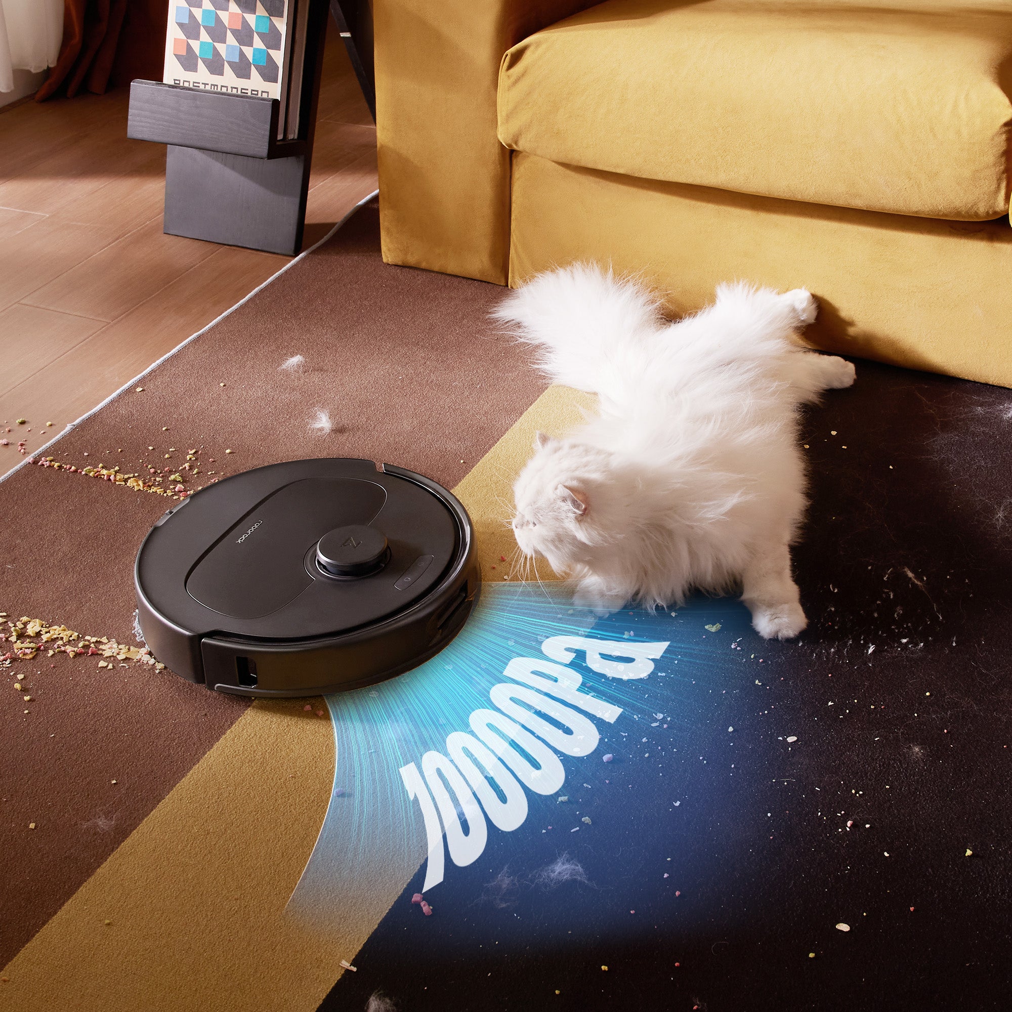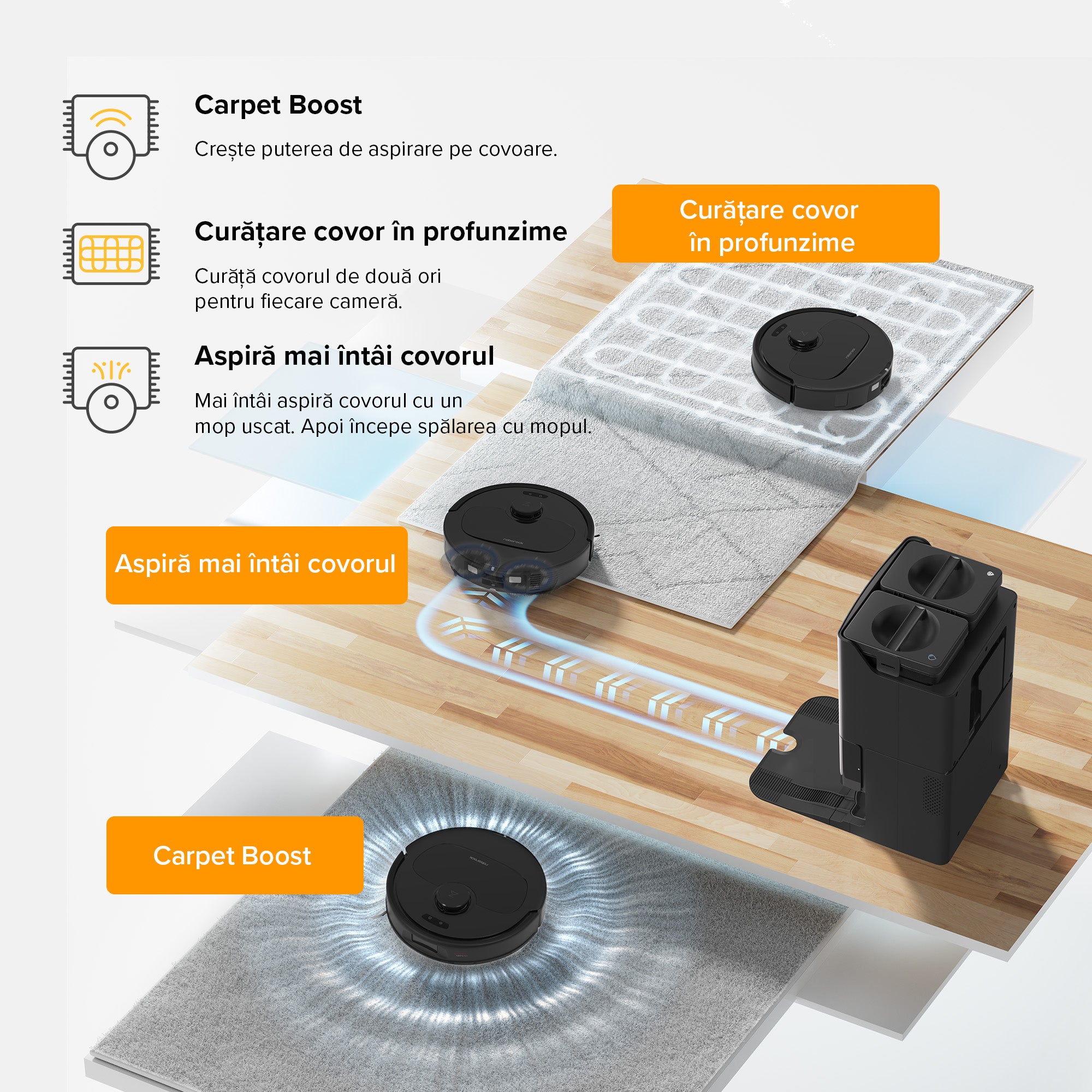 Stația de andocare multifuncțională gestionează fără efort curățenia locuinței. Datorită puterii de aspirare HyperForce de 10.000 Pa, robotul aspiră și cele mai fine particule de praf. Peria laterală anti-încurcare previne înfundarea, în timp ce mopul care se ridică evită umezirea covoarelor.